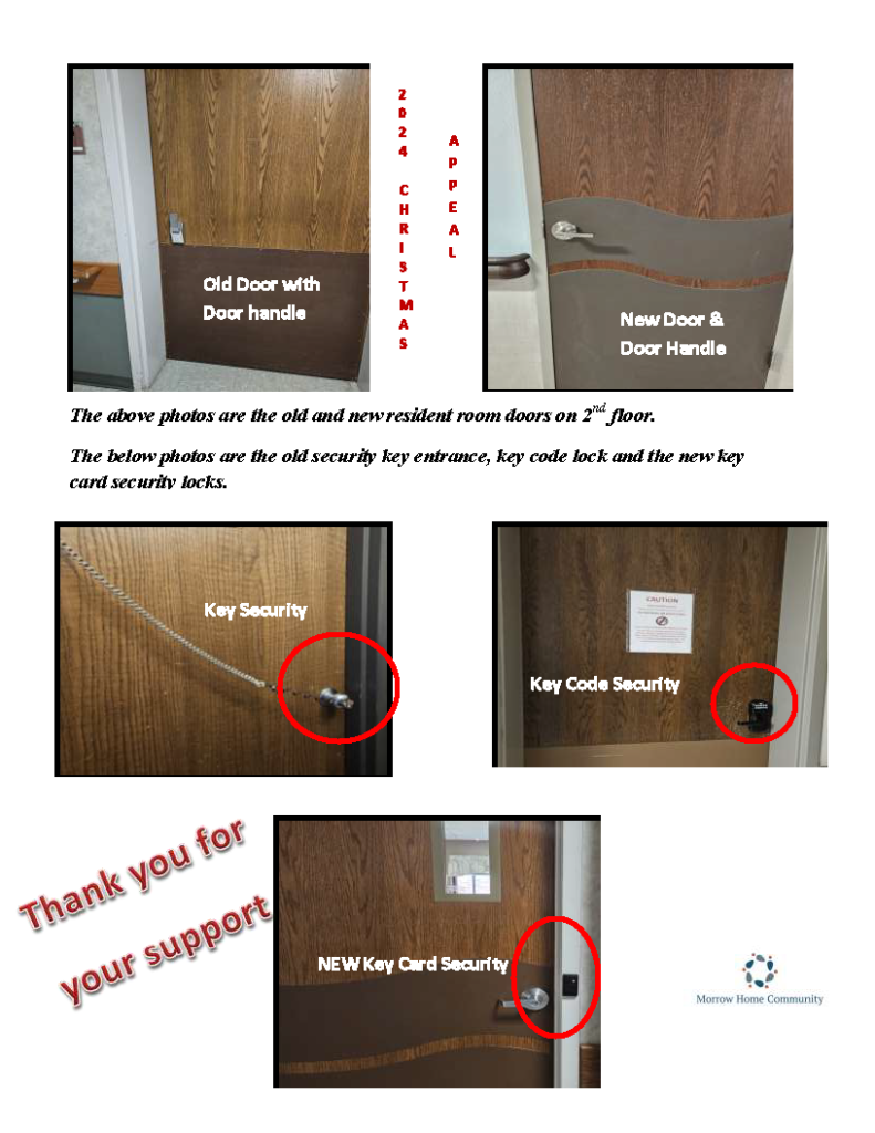 We would like to acknowledge the generosity of those who donated to the 2024 Christmas Appeal. Those donations were used to continue the second floor nursing home remodel and updates. Donations were used for new room doors, door handles and security locks to aid in protecting our residents on the second floor north wing.
